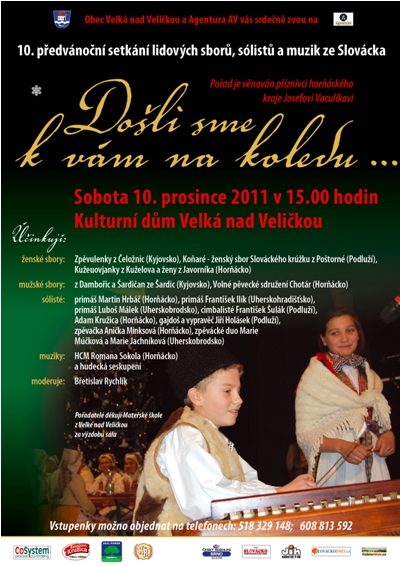 Nyní se vydáme do Velké nad Veličkou, kde Tonda Vrba připravil na 10. prosince další z pořadů, které nesou název Došli sme k vám na koledu. Pojďme se podívat na jeviště, na které se Tonda snaží přivést zajímavé "sestavy" muzikantů z různých míst Slovácka, což se mu podařilo i tentokrát. Za pozornost stojí také moderátor, kterým byl známý Břetislav Rychlík - myslím, že je to už dlouho, co takto ve Velké moderoval mimo Horňácké slavnosti.